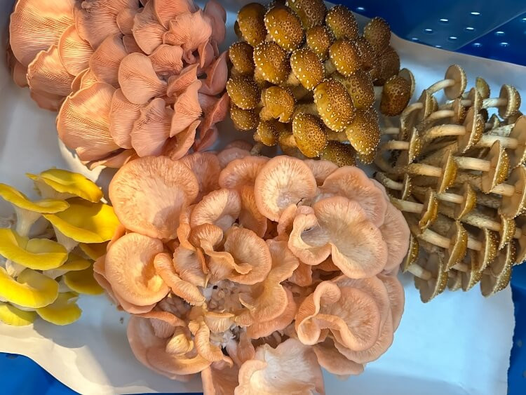 A colourful mix of gourmet mushrooms often containing chestnut mushrooms, a variety of oyster mushrooms, and lions mane!